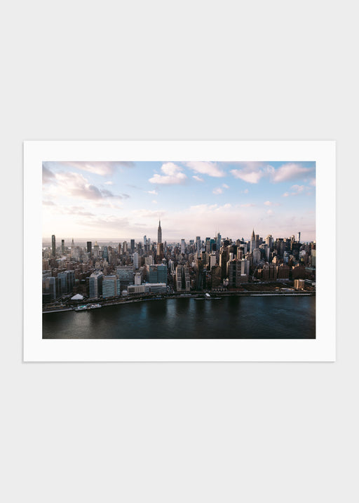 Bild över New York från ett fågelperspektiv. Kontrasten mellan den ljusa himlen och det mörka vattnet skapar ett spännande känsla. Fotografiet är ...