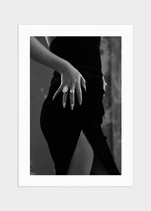 Kaxigt svartvitt motiv föreställande en kvinna i en snygg svart klänning med slits tillsammans med vackra smycken från Caroline Svedblom. Rama in m...