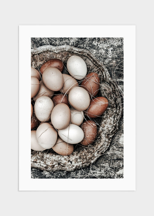Vackert motiv fotograferat av Årstidens Bästa föreställande bruna och beiga ägg med höstlöv runt om. Hela bilder går i mjuka varma toner och skapar...