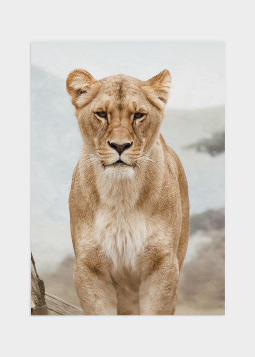Vackert porträtt på en lejonhona i sobra färger. Motivet trycks på ett matt premiumpapper.