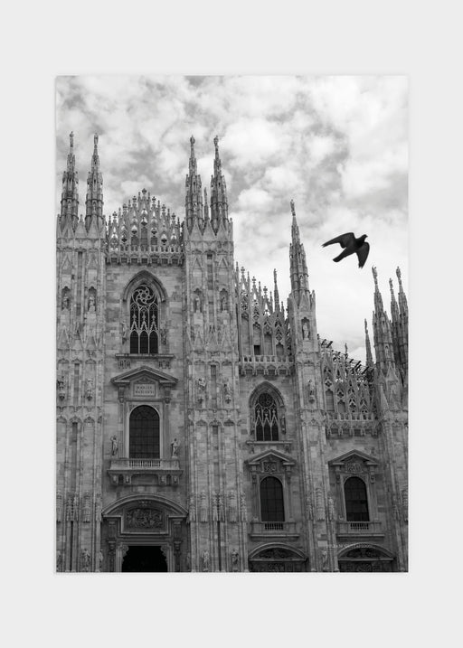 Svartvitt motiv av vackra Duomo Cathedral i Milano fotograferat av Julia M. Gustafsson. Kyrkan är den näst största gotiska katedralen i vä...
