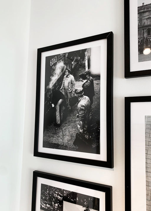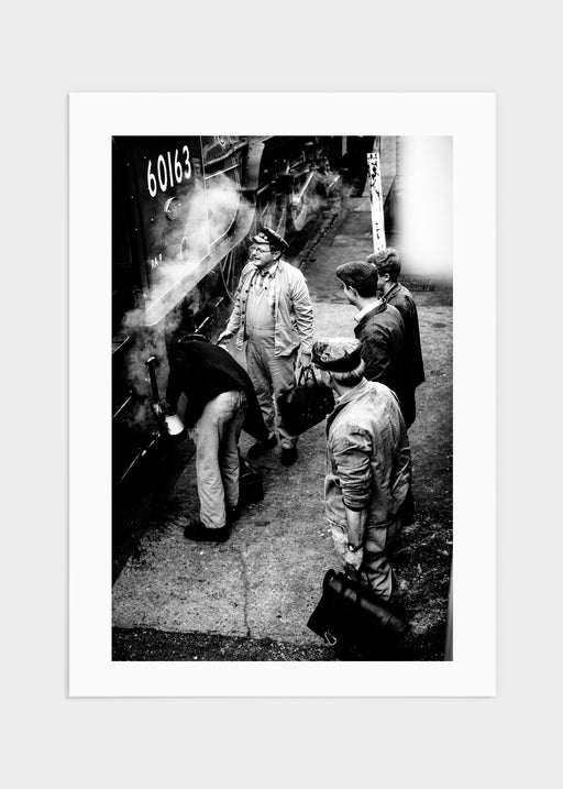 Vackert svartvitt fotografi som taget ur en gammal film! Bilden visar människor på en tågstation bredvid ett stort svart tåg och med rök som pyser...