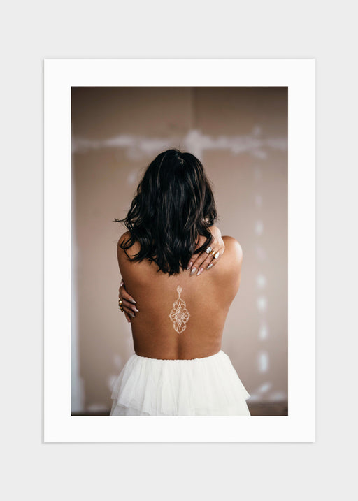 Romantiskt och bohemiskt motiv föreställande en kvinna i mörkt hår klädd i en vit tyllkjol. Motivet går i bruna,beiga och vita färger och passar fi...