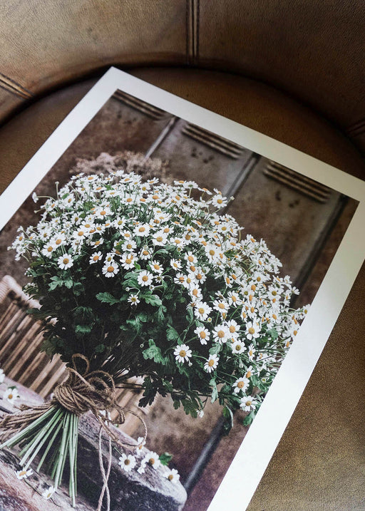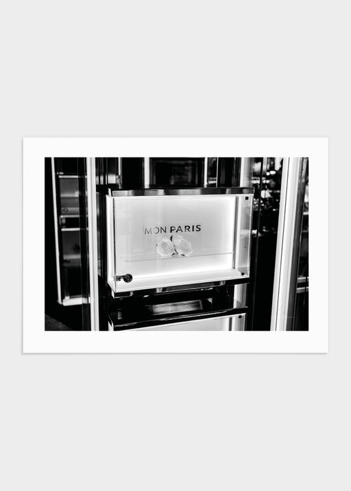 "MON PARIS"-skylt i en glasbox med två vackra vita blommor inuti. Bilden är svartvit och passar perfekt för dig som vill ha något stilrent och tren...