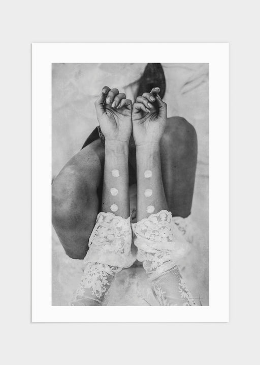 Svartvitt motiv på en kvinna som har på sig en vit klänning med spetsarmar. Armarna har vita prickar målade på sig för att skapa en bohemisk kä...