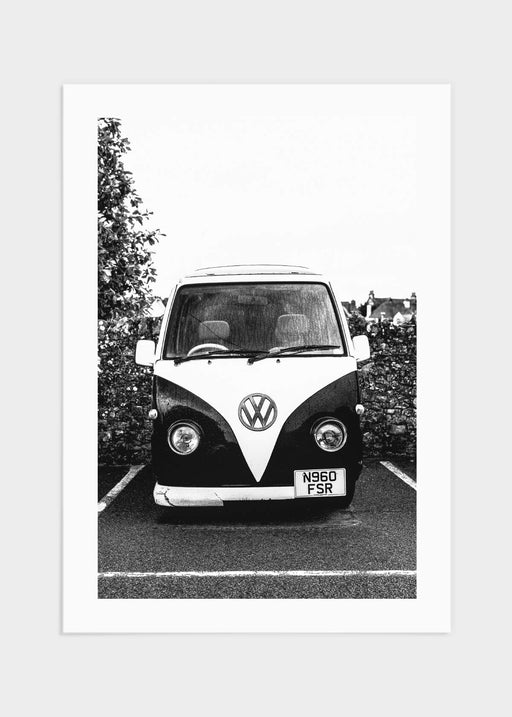 Svartvitt fotografi av en Volkswagen van taget av Julia M. Gustafsson i Skottland. Vanen är en mycket populär roadtrip-bil och älskas av många på g...