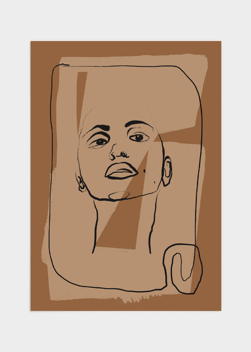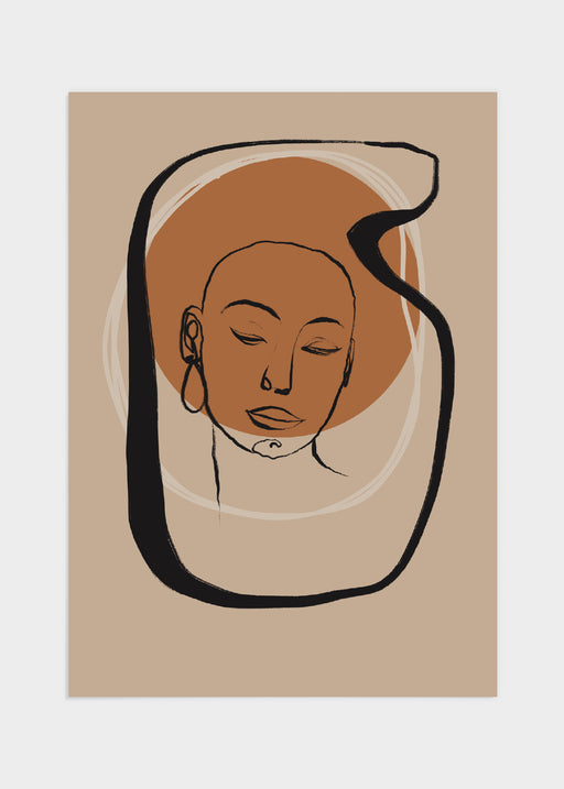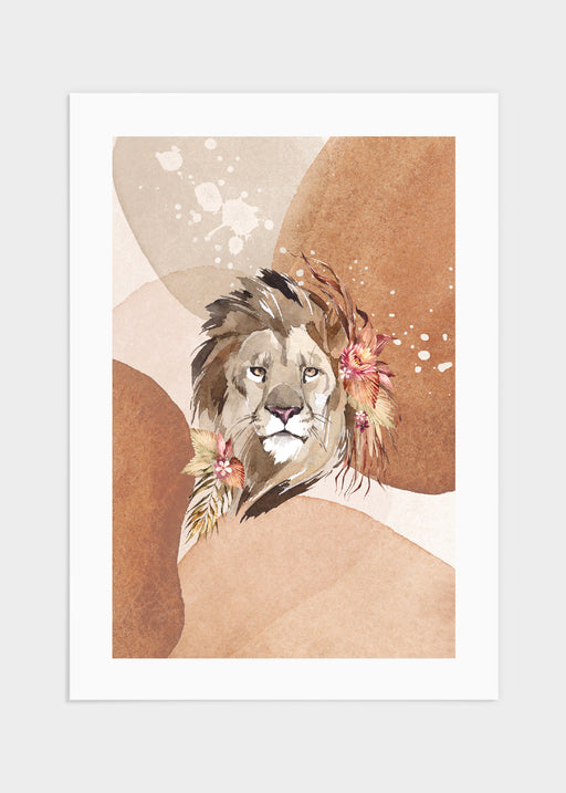 Vackert porträtt på en lejonhane i jordnära toner. Motivet är lekfullt skapat med färgskvätt i off white och nyanser av rostrött och beige i bakgru...