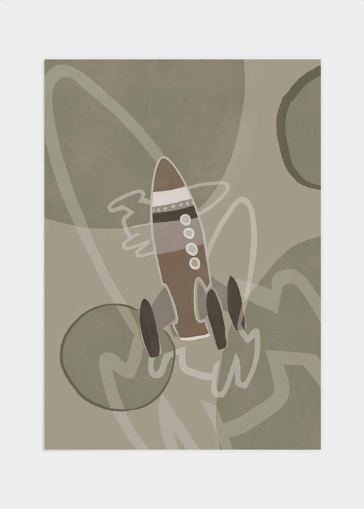 Modernt och trendigt barnmotiv föreställande en rymdraket i grafisk stil. Motivet går i gröna och bruna toner. Skapa en lekfull atmosfär i barnr...