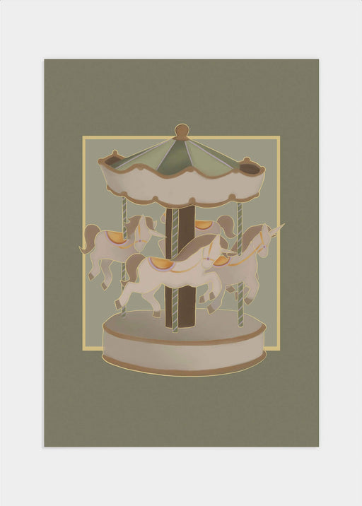 Ett stilrent och modernt barnmotiv i gröna och beige-gråa toner. Motivet föreställer en karusell med hästar. Motivets detaljer går i gula, lila ...
