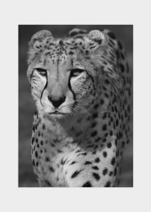 Fotografiskt motiv av en vacker Gepard. Motivet är svartvitt och tryckt på ett matt premiumpapper.