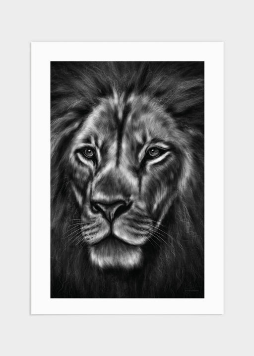 En illustration föreställande ett porträtt av ett lejon i färgerna grått, vitt och svart. Motivet bjuder på flera vackra och välgjorda detaljer och...