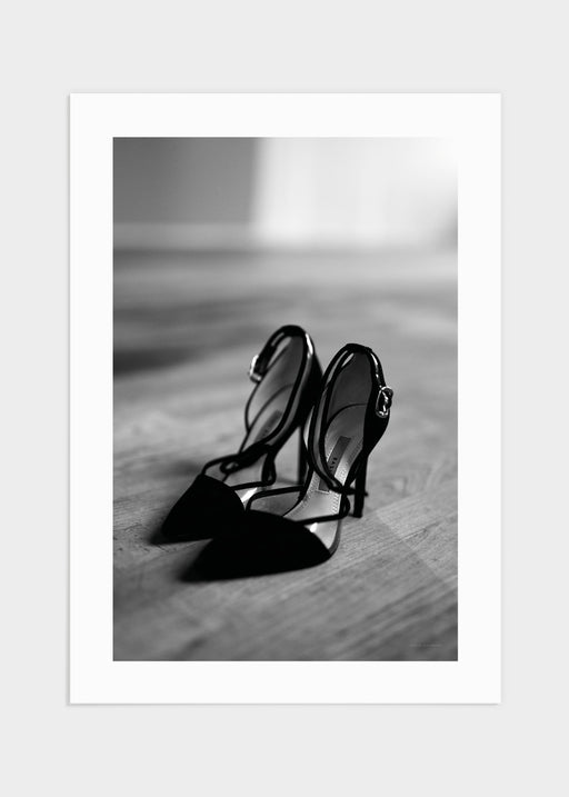 Minimalistiskt och stilrent fotografi i svartvitt. Motivet föreställer ett par svarta stilettklackar som står på ett trägolv. Låt motivet tala för ...