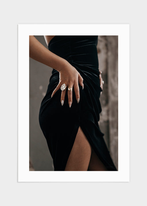 En bild som utstrålar en lyxig och exklusiv känsla. Kvinnan bär en svart sammetsklänning och vackra ringar från Caroline Svedbom. Motivet är fotogr...