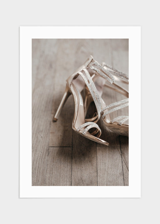Fotografti i beiga toner föreställande ett par snygga klackskor fyllda med strass. Skorna har hög stilettklack och ligger på ett vackert ljust träg...