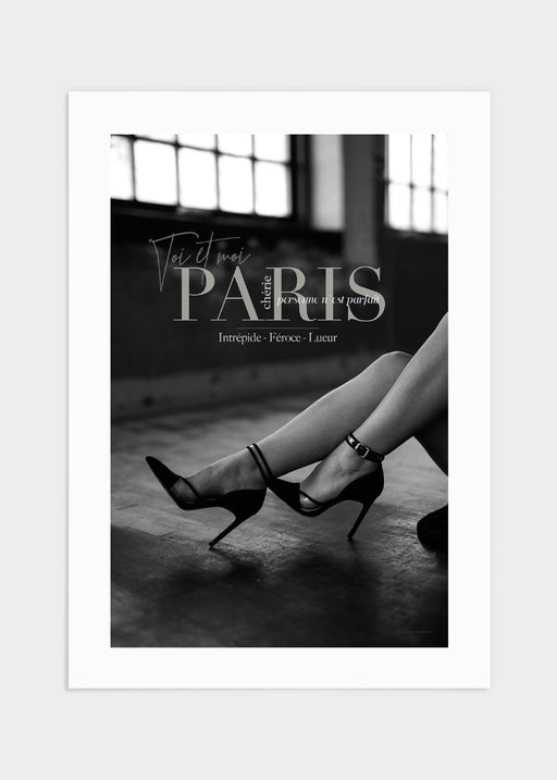 Svartvitt motiv av ett par svarta stilettklackar tillsammans med texten PARIS och flera vackra ord på franska. Bland annat: "orädd - passionerad - ...