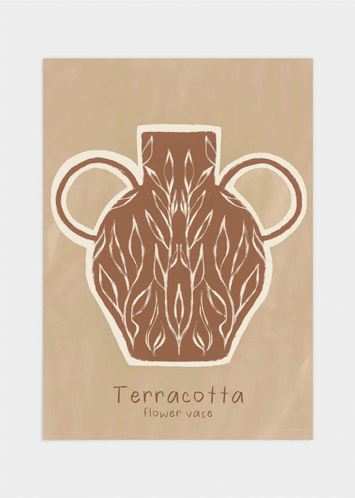 Blomvas med vackert bladmönster. "Terracotta flower vase" har en beige bakgrund och en terracotta-färgad vas illustrerad av Julia M. Gustafsson. Ra...