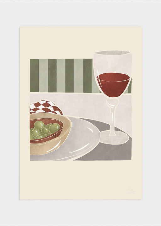 Trendigt och stilrent motiv föreställande ett glas med rödvin tillsammans med en skål med oliver. Glaset och skålen står på ett grått bord och har ...