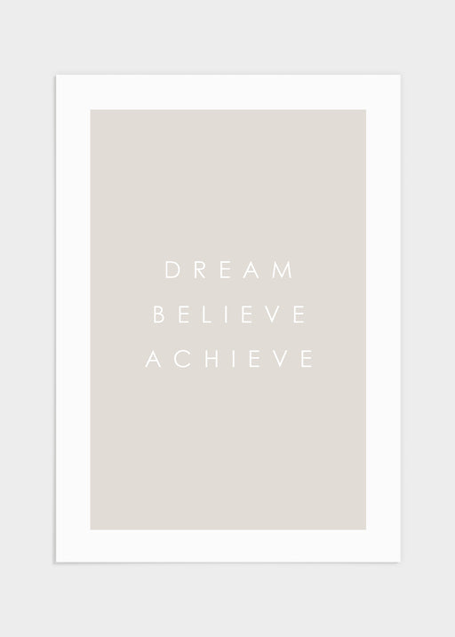 Ett beige textmotiv med en vit kant som ramar in. Texten DREAM BELIEVE ACHIVE är skrivet i vitt. Postern är tryckt på ett matt premiumpapper. Ti...