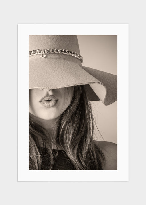 Anonymt porträtt på en kvinna med utsmyckad hatt och utsläppt hår. Motivet går i en sepia-ton och passar fint för dig som vill ha något stil...