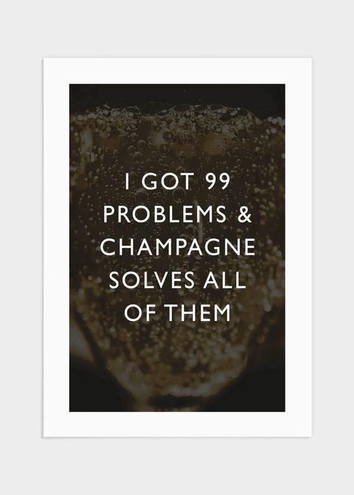 Motiv med texten "I got 99 problems & champagne solves all of them" - i bakgrunden skymtas ett glas med champagnebubblor. Motivet trycks...