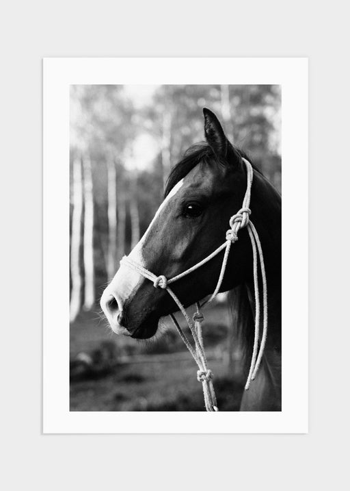 Vackert porträtt på en häst med vit mule. Varm svartvit bild med brus i för att ge en lite gammaldags känsla. Ett tidlöst motiv för hästälskare! ...
