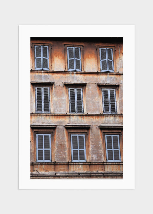 Fotografi av charmiga och slitna fönster i Rom. Fotografiet har en härlig karaktär med den slitna fönsterfasaden och de blåa fönsterluckorna. Fasad...