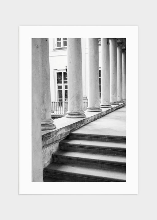 Vacker arkitektur i form av höga pelare och trappor upp till palatset inne i Lazienkiparken i Warszawa. Svartvitt motiv fotograferat av Julia M. Gu...
