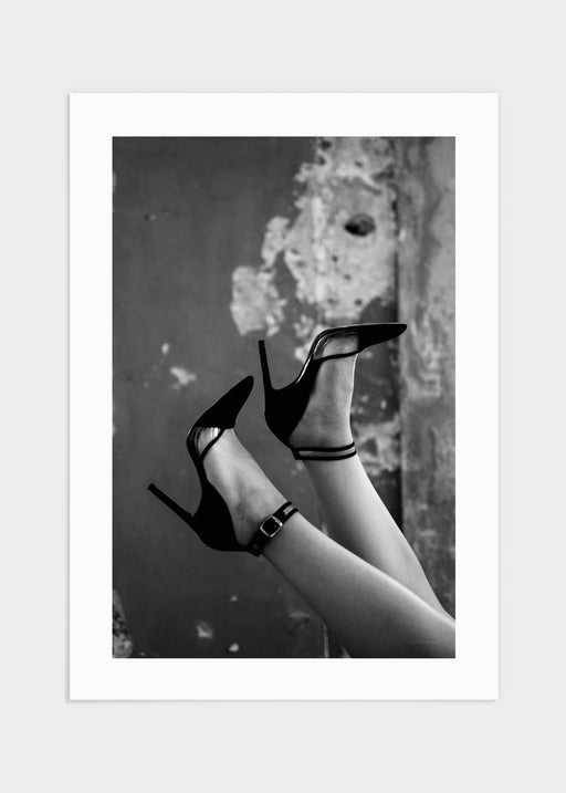Annorlunda och roligt svartvitt motiv föreställande ett par ben upp i luften med ett par snygga svarta stilettklackar. För dig som vill skapa en ka...