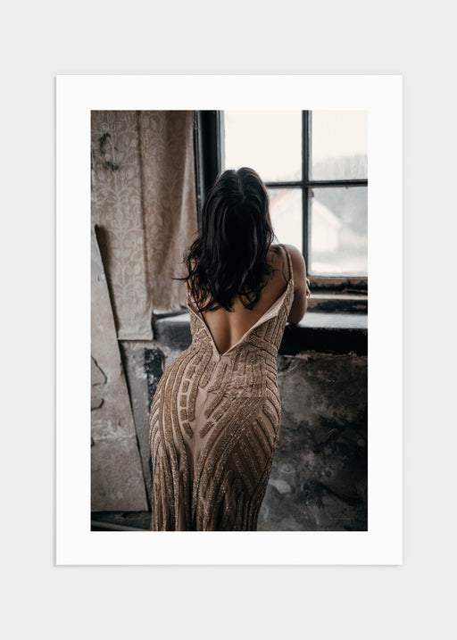 Romantiskt fotografi föreställande en kvinna i en lyxig strassklänning i guld. Klänningens rygg är uppknäppt och kvinnans mörka lockar faller över ...
