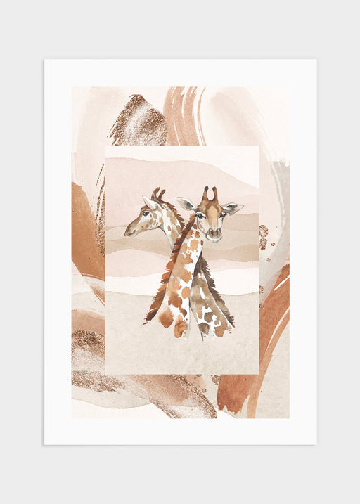 Porträttmotiv av två giraffer i en härlig blandning utav orange, brunt, guld, beige och vitt. Skapa en lugn oas för dina barn med detta harmoniska ...