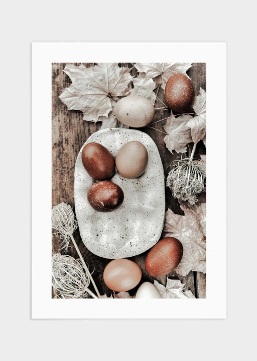 Vackert motiv fotograferat av Årstidens Bästa föreställande bruna och beiga ägg med höstlöv runt om. Hela bilder går i mjuka varma toner och skapar...