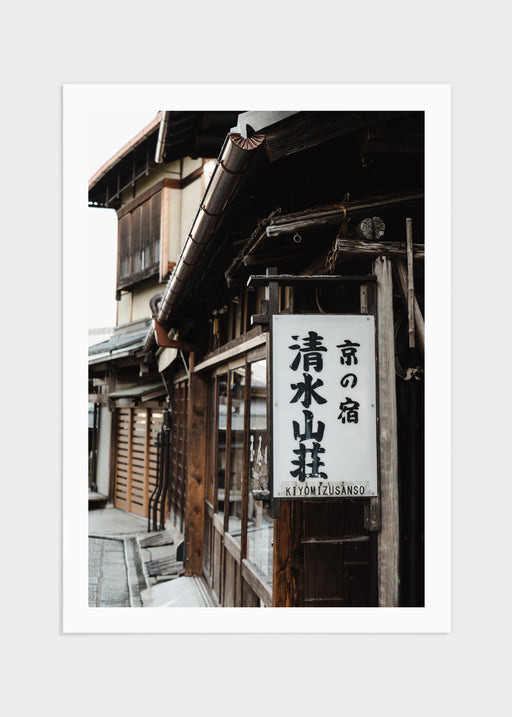 Fotografi av en byggnad och skylt med japansk text i vackra staden Kyoto, Japan. De mjuka neutrala färgerna i motivet passar fint in i de flesta he...