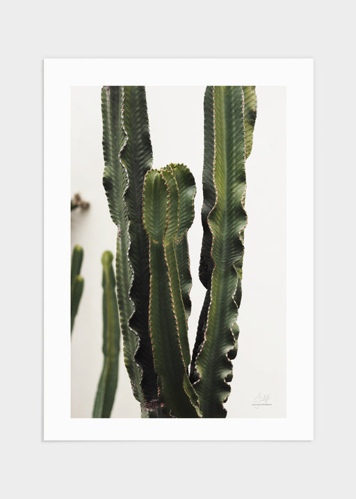 Fotografi på en kaktus i Marbella tagen av Julia M. Gustafsson. Postern har en ljusbeige bakgrund med en vit kant runt om som ramar in motivet. De...