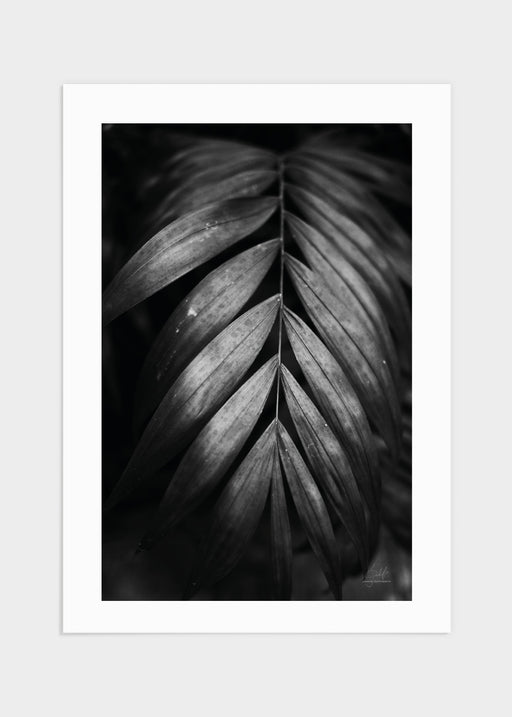 Svartvitt fotografi av en tropisk växt. Fotot är taget nära växten och ger ett spännande djup i bilden tack vare fokusets placering. Motivet är tag...