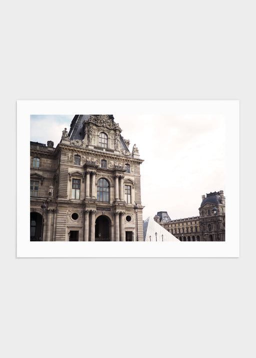 Bild på pampiga byggnaden Louvren i Paris. Byggnaden bjuder på enastående arkitektur och detaljer med stora fönster som reflekterar himlen och mol...