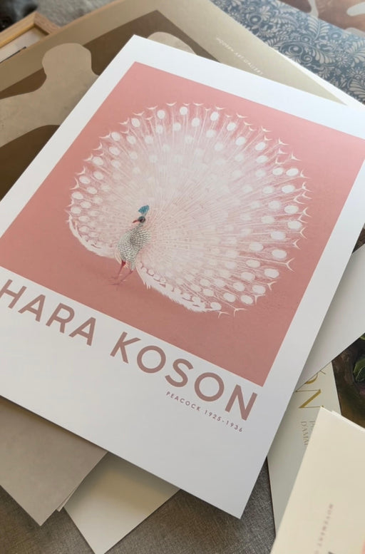 Peacock av kända konstnären Ohara Koson. Låt den här vackra påfågeln med rosa bakgrund ge ett trendigt och lekfullt intryck i ditt hem. Motivet har...