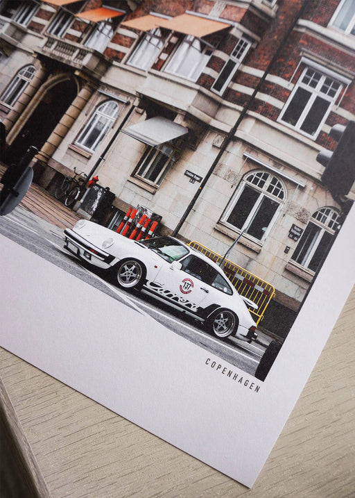 Tidlöst motiv av en vacker byggnad i Köpenhamn med spännande karaktär och jordnära toner i beige, orange och brunt. Nedanför står en vit Porsche Ca...