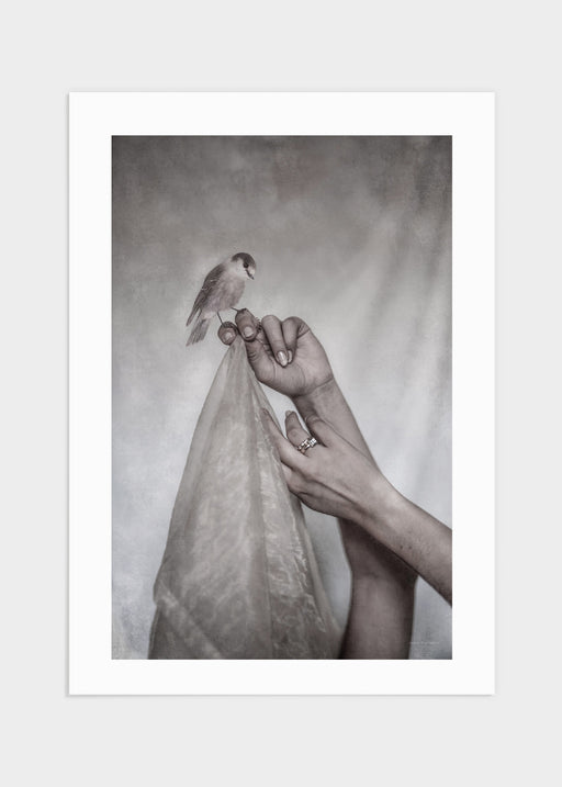 Ett vackert och surrealistiskt motiv föreställande två händer som håller i ett transparant tyg. På ena handen sitter en fågel och motivet går i...
