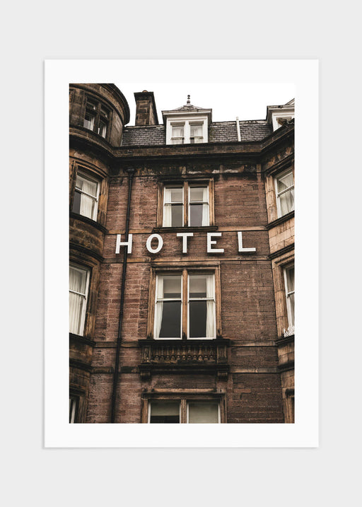 Vacker hotellbyggnad i sten, fotograferat i staden Inverness i Skottland av Julia M. Gustafsson. I fönstret syns vita skira gardiner och fasaden på...