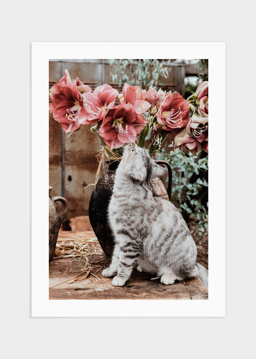 Charmigt fotografi av en liten kattunge som doftar på blommor i en vas. Motivet är taget av floristen Linda Hansson, även känd som Årstidens Bästa....