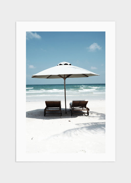 Vackert tropiskt motiv från Vietnamn, föreställande två solstolar i skuggan av ett vitt parasoll. Motivet visar även en kritvit sand och kristallkl...