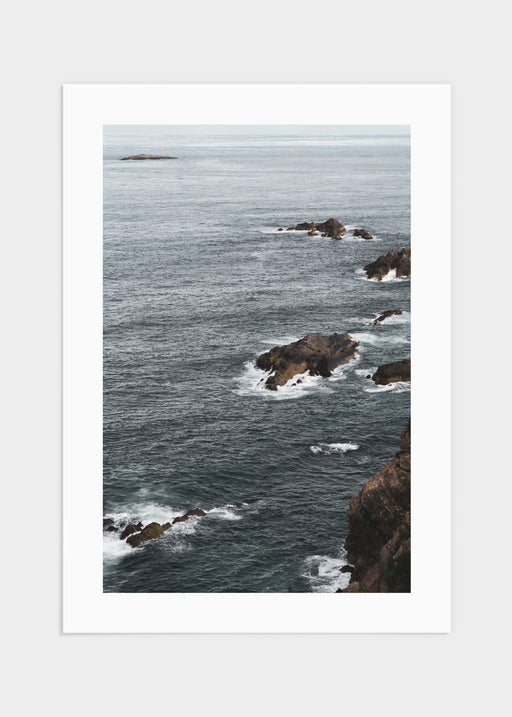Svartvit dramatisk bild på Stilla Havet (The pacific ocean) fotograferat utav Noah Gustafsson. De mörka dramatiska klipporna skapar en spännande ko...