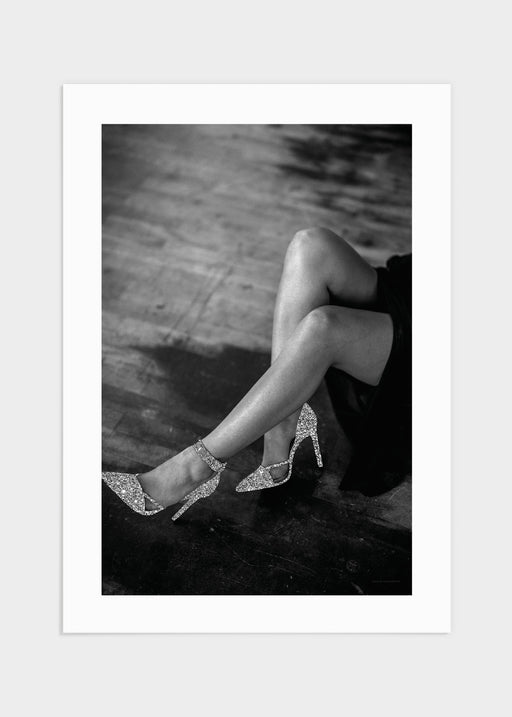 Vackert svartvitt motiv föreställande ett par glittriga stilettklackar, i bakgrunden syns ett rustikt trägolv. Skapa en exklusiv känsla i ditt hem ...