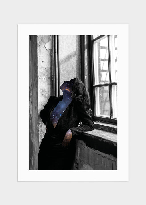 Unikt och annorlunda motiv i form av en kvinna i svart glittrig klänning lutandes i ett fönster. Kvinnan är täckt av galaxmönster som skapar en drö...