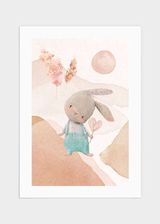 Charmig illustration föreställande en kanin som bär blåa hängselbyxor och en tröja. Kaninen går i gråa nyanser medans bakgrunden går i dovt roströd...