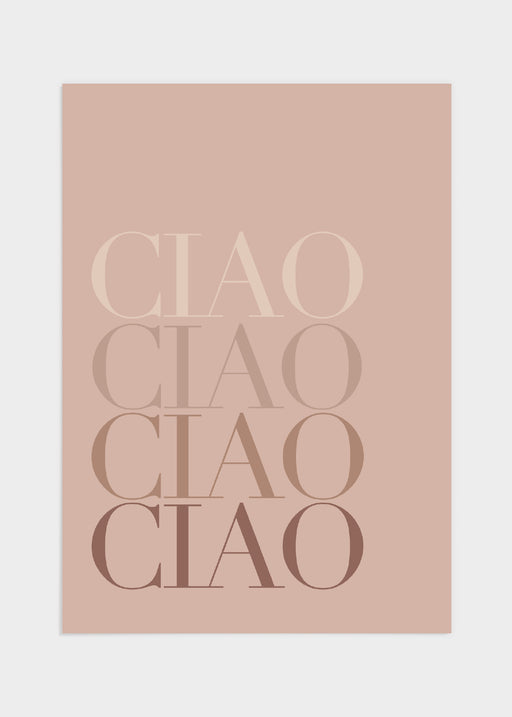 Rosa poster med texten "CIAO, CIAO, CIAO, CIAO" i olika rosa nyanser som går från ljust till mörkt. Motivet passar perfekt in i ett vardagsrum som ...