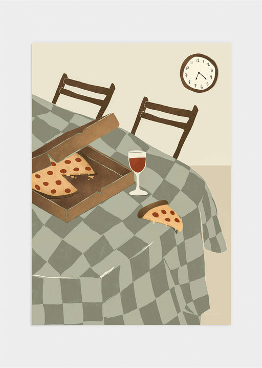 Trendig och lekfull illustration av Julia M.Gustafsson. Postern föreställer ett bord med en grön rutig duk, två trästolar och en klocka på väggen. ...