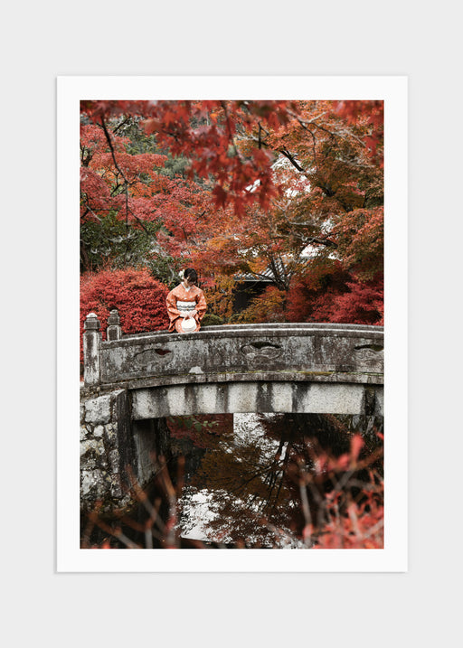Vackert fotografi av en kvinna som står på en bro iklädd en kimono. Kimono är en japansk tradition som bärs inlindade vänster sida över höger och s...