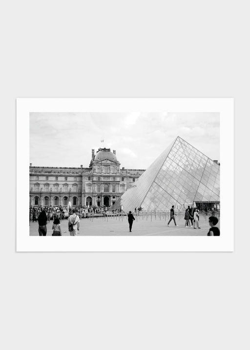 Svartvitt fotografi taget utanför Louvren i Paris, världens mest kända museum med bland annat porträttet av Mona Lisa. Byggnaden bjuder på enastå...