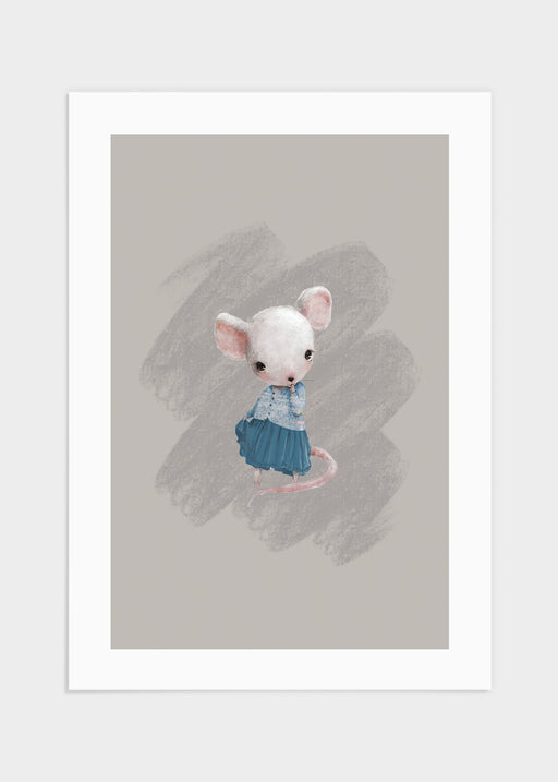 Charmig illustration föreställande en liten mus som bär blå kjol och en tröja. Musen är i en ljusgrå färg medans bakgrunden går i en mörkare grå ny...